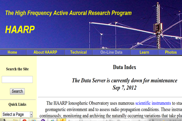 La página oficial del proyecto de aurora activa HAARP, ha dejado de funcionar, extrañamente, porque esa web nunca a presentado ningún tipo de problema. Desde el día 7-9-2012 hasta nuestras fechas esta web presentaba el siguiente mensaje :