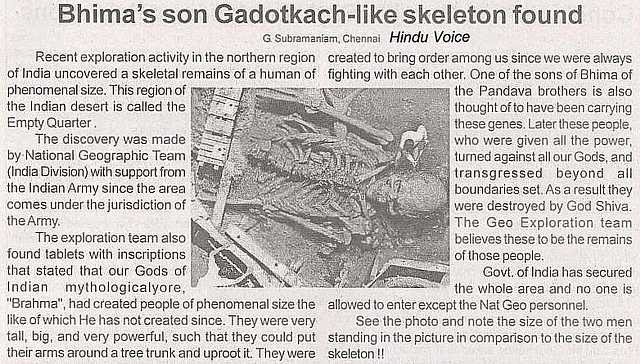 «Una exploración reciente en una región al norte de la India, descubrió los restos de un esqueleto de dimensiones extraordinarias. Esta región del desierto se llama Empty Quarter. En español «distrito vacío»