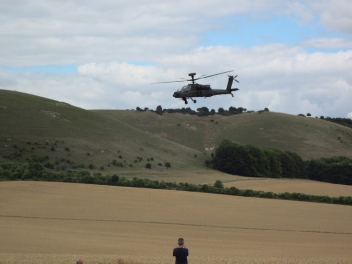 Pero no siempre sobrevuelan los círculos los helicópteros de reconocimiento tipo Eurocopter Fennec; a veces merodean sobre las figuras helicópteros artillados como este Apache militar. ¿Es realmente un Apache militar armado hasta los dientes?