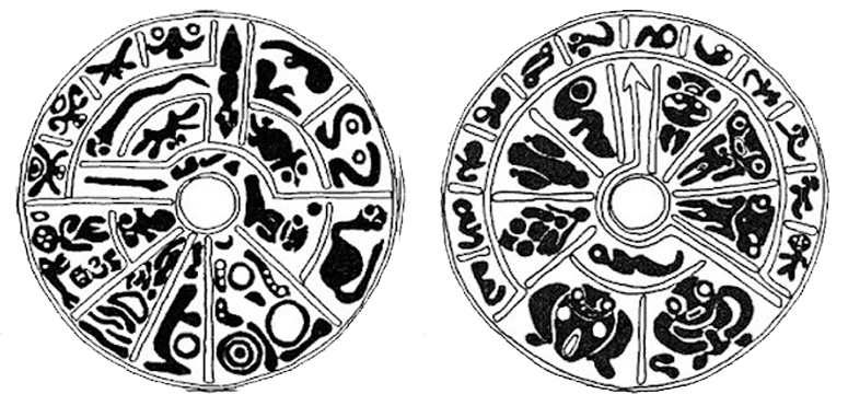 El contenido del disco es mucho más inquietante, muestra el ciclo para el desarrollo de un humano desde una perspectiva microscópica hasta la fase final, algo que sería imposible de observar sin tecnología. También contiene dibujos en cadena de diferentes animales haciendo una escala evolutiva hasta llegar al hombre y faltando «algo» entre el humano y el simio. La última imagen parece que representa un padre con un hijo.discos