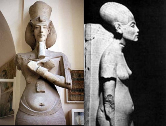 Tras el tiempo de Zep-Tepi, surgieron faraones considerados descendientes de los Dioses. Estos eran representados como grandes hombres bien musculados, cuerpo triangular y siempre bajo el mejor aspecto. Sin embargo, existió un faraón que decidió romper 1000 años de representaciones de los faraones y el culto a los Dioses. Este faraón se llamaba Akenaton (1352 AC) decidió borrar todo registro de los antiguos Dioses egipcios  y mandó cambiar las representaciones sobre los faraones. Quería que se le retratara tal y como él era. Su cuerpo era extraño, presentaba rasgos femeninos muy puntiagudos y una barriga bastante pronunciada. Pero sin ninguna duda la parte más extraña de su cuerpo fue la cabeza ya que presentaba una deformación que la hacia alargada.images