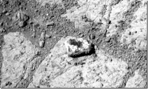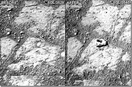 Al parecer , una roca se ha movido (O por lo menos es la primera conclusión a la que cualquier persona puede pensar). La primera fotografía tomada de la zona se realizó antes de iniciar el modo de suspensión para re calibrar durante un largo periodo los sistemas del robot y los de energía. Después de esta etapa, antes de iniciar de nuevo el robot se tomó otra fotografía, correspondiendo con la misma zona de la primera, apareciendo en esta una roca que antes no estaba.