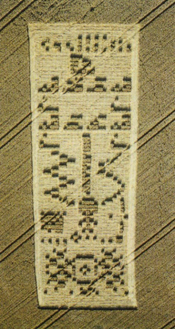 El tiempo pasó y 27 años después, la noche del 20 de agosto de 2001, parece que recibimos la respuesta de nuestros vecinos del cosmos. En un campo de trigo cercano al radiotelescopio de Chibolton, en Hampshire (Reino Unido) que posee vigilancia militar, aparecieron dos dibujos complejos, uno parecía la respuesta también en código binario al mensaje original y el otro mostraba un misterioso rostro.