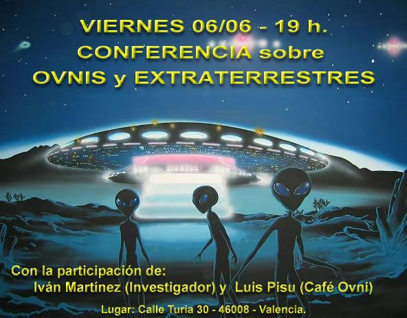 IMG-20140605-WA0000Mañana doy mi primera conferencia en valencia sobre Ufología moderna. Es gratuita pero creo que solo hay plazas para 30 personas. De todas formas la grabaré para subirla al canal. Si alguien quiere acercarse yo me quedaré antes y después de la conferencia en las instalaciones para charlar con vosotros. Un Cálido abrazo