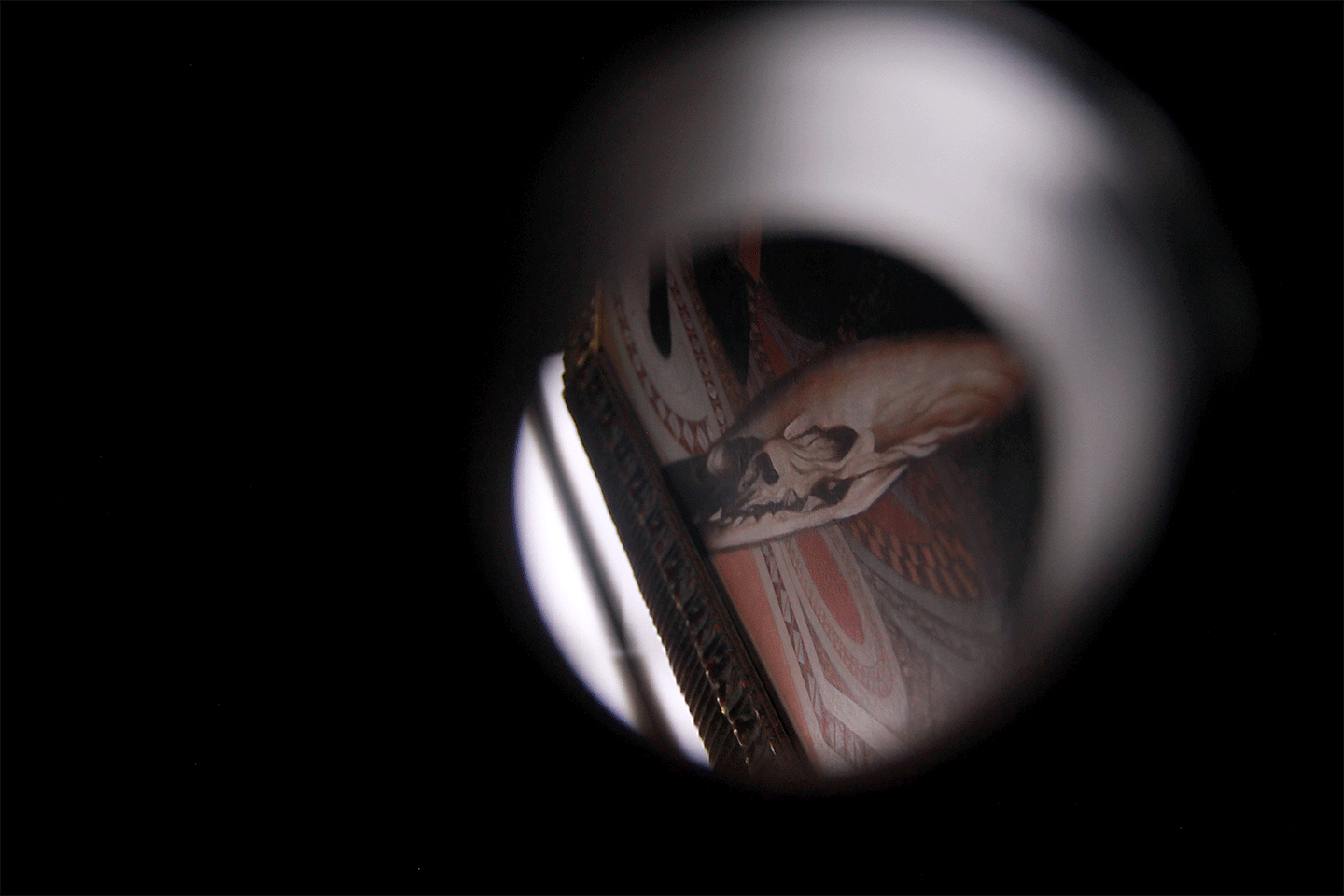 Cosmocaixa recoge en su exposición dos ejemplos de anamorfosis. El primero es una figura geométrica descompuesta que solo se hace visible desde un punto concreto dentro del espacio que le rodea. La segunda, encierra mucho más dentro de sí. En este caso hablamos de la famosa calavera que se halla dibujada, de manera anamórfica, a los pies del cuadro de Los Embajadores de Hans Holbein (1533) y que solo se puede contemplar, de nuevo, desde un punto concreto. Esta calavera misteriosa, aparte de representar, seguramente, la muerte; quizá simboliza, también, la forma puntual en el tiempo de la llegada de esta y el proceso único de alcanzarla o que nos alcance.